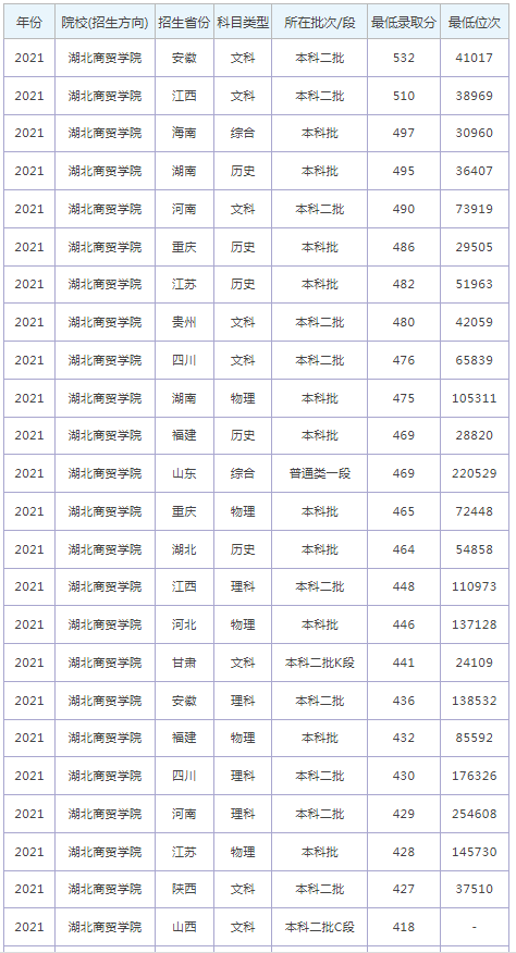 想要報考湖北商貿學院的同學,都比較關注湖北商貿學院2022年的錄取分數線,那么,高考多少分可以上湖北商貿學院呢?湖北商貿學院歷年最低錄取分數線是多少?下面為大家整理了湖北商貿學院錄取分數線2022是多少分(含2021-2022歷年),希望對大家有所幫助,僅供參考。![]() 湖北商貿學院錄取分數線2022是多少分? 截止到目前,湖北商貿學院2022年錄取分數線還未公布,如果需要2022年湖北商貿學院分數線的同學,不妨參考2021年湖北商貿學院錄取分數線和湖北商貿學院歷年錄取分數線,希望對大家有所幫助,如有不同,請以湖北商貿學院官網最新公布的信息為準。 2021湖北商貿學院錄取分數線 ![]() ![]() 湖北商貿學院是公辦還是民辦大學? 根據全國高等學校信息可知,湖北商貿學院是民辦大學。通常來說,公辦大學社會認可度高,各專業學費較便宜,民辦大學各專業收費較貴。 ![]() 湖北商貿學院簡介 湖北商貿學院(Hubei Business College)位于湖北省武漢市,坐落在南湖之濱,位于武漢光谷中心地帶,是經教育部批準成立的具有舉辦全日制本、專科學歷的普通高等本科院校。 1995年,湖北工業學院商貿學院創辦。2004年,湖北工業學院更名為湖北工業大學,學院更名為湖北工業大學商貿學院。2015年4月28日,經教育部批準由湖北工業大學商貿學院轉設為獨立設置普通高等本科院校-湖北商貿學院。 通過對湖北商貿學院錄取分數線的了解,大家大概知道了高考多少分可以上湖北商貿學院,以上數據源于網絡,僅供參考,大家如果想要了解其他大學錄取分數線、大學簡介、大學排行榜、專業選擇等內容,請點擊訪問:大學欄目。 推薦閱讀: 西安交通大學錄取分數線 浙江大學錄取分數線 中國農業大學錄取分數線 哈爾濱工業大學錄取分數線 北京師范大學錄取分數線 中央民族大學錄取分數線 |