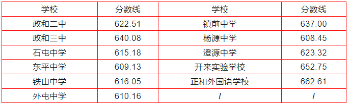 政和一中定向招生計劃未完成,剩余定向指標面向全縣擇優錄取分數線:677.75 三、政和二中統招錄取分數線:555.09 四、政和三中統招錄取分數線:525.17 五、正和外國語(民辦)統招錄取分數線:426.77 邵武市普通高中最低錄取控制分數線一、邵武一中統招錄取分數線:687.55 二、邵武一中定向招生各校錄取分數線