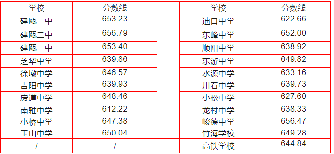 注:1、建甌一中定向生錄取最低控制分數線632.93. 2、未完成建甌一中定向招生計劃4人,按規定在14所農村中學進行補錄,其中吉陽中學補錄3人、東游中學補錄1人。 三、建甌一中中澳班錄取分數線:674.95 四、建甌二中統招錄取分數線:662.25 五、建甌二中定向招生各校錄取分數線