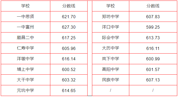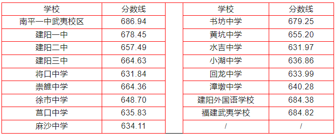 建陽一中未完成定向招生計劃,剩余指標的定向生錄取分數線:面向全區683.65;面向農村中學645.32 五、建陽二中:598.28 六、麻沙中學:472.07 七、福建武夷學校:458.94 八、建陽外國語學校:618.85 順昌縣普通高中最低錄取控制分數線一、順昌一中統招錄取分數線:669.05 二、順昌一中定向招生各校錄取分數線
